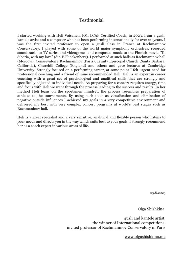 Suosittelen lämpimästi VisioSi hyvinvointipalveluita ja Heli Väisästä. Helin kehittämä Toipumisen tiekartta™ – hyvinvointivalmennus on ainutlaatuinen Suomessa ja Helin tekemä yhteistyö asioita tutkivien lääkäreiden ja muiden asiantuntijoiden kanssa kehittää valmennuskonseptia koko ajan. Heli on saanut valmennuksiin osallistuvilta ylistävää palautetta empatiastaan, innostuksestaan, ilostaan, kyvystään paneutua jokaisen osallistujan tilanteeseen sekä kannustamisesta ja rohkaisemisesta eteenpäin. Lisäksi yhteistyö Helin kanssa on ollut saumatonta ja joustavaa.